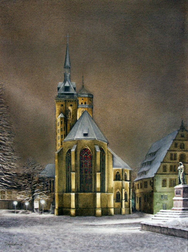 Künstlerkarte DIN A6 Format mit weißem Umschlag. Das Motiv ist die Stiftskirche in Stuttgart "Andacht"Preis: €3,00
