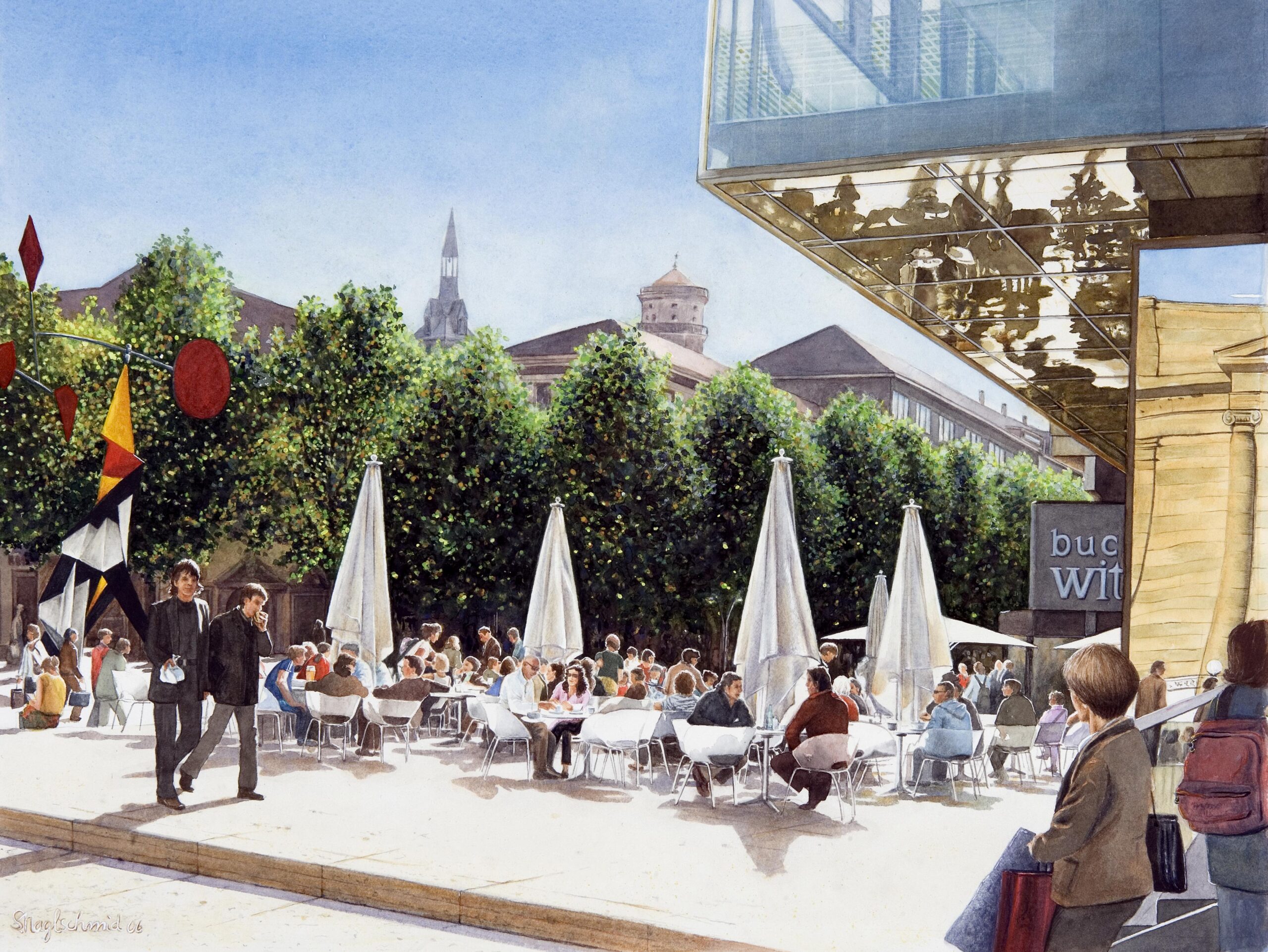 Künstlerkarte DIN A6 Format mit weißem Umschlag. Das Motiv ist das Kunstmuseum in Stuttgart "Kunst spiegelt Leben"Preis: €3,00